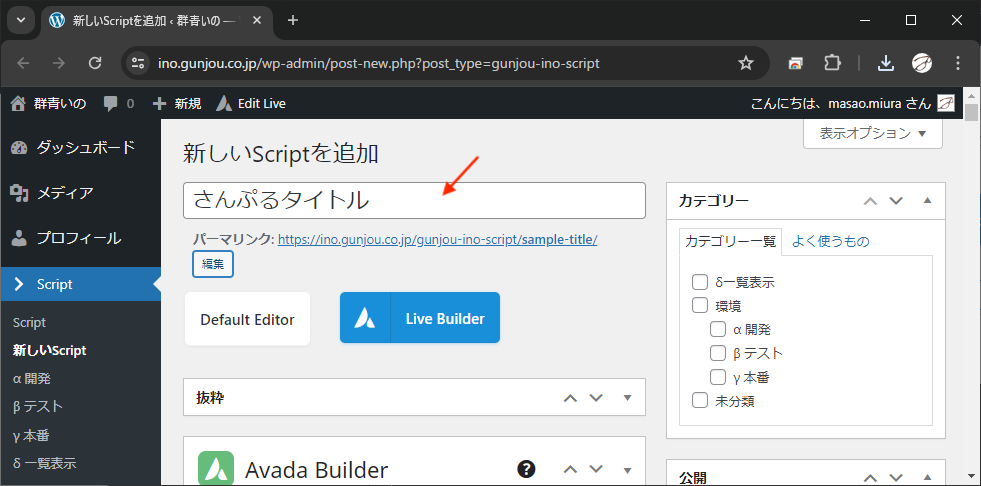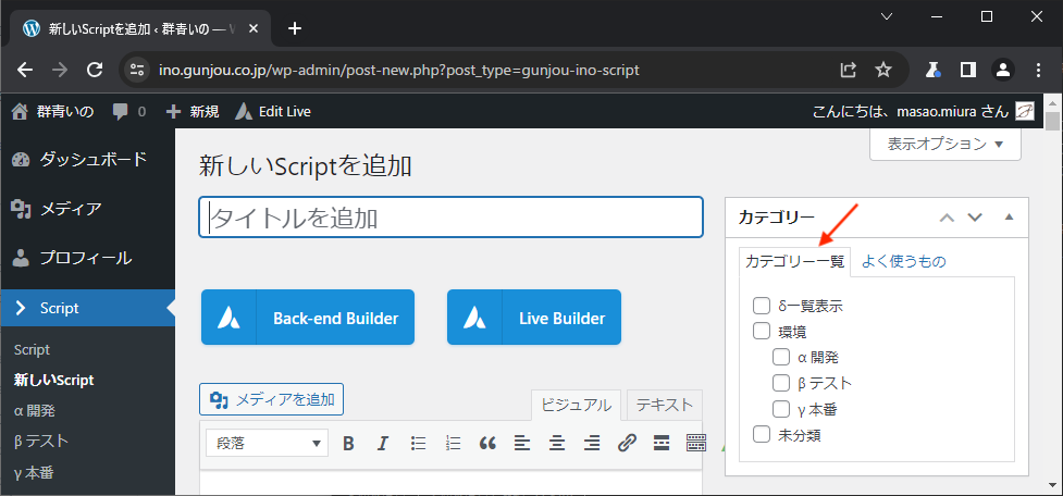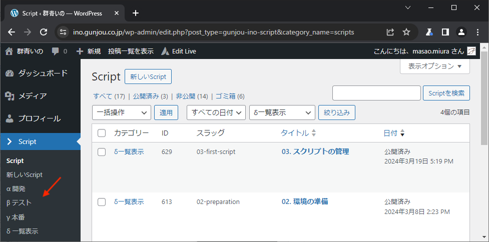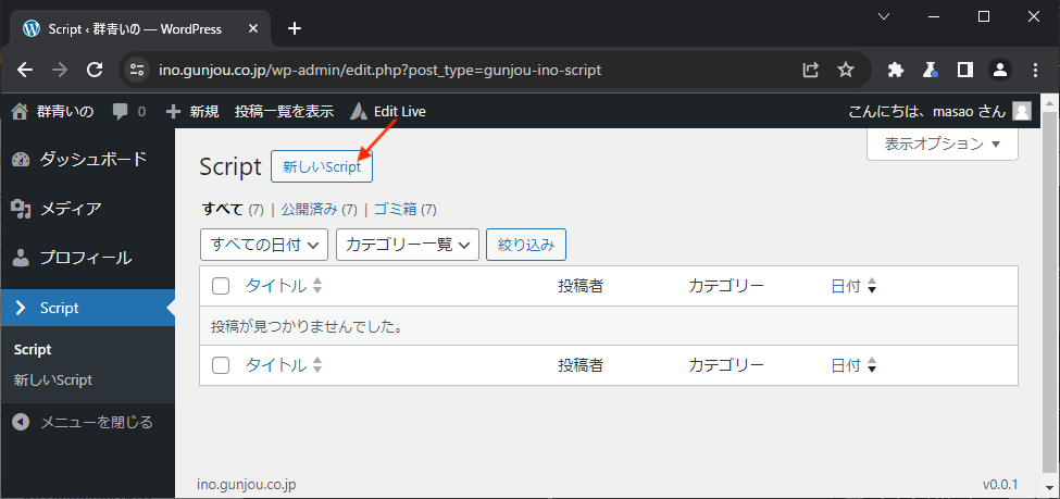 サブメニューからカテゴリー毎のリストを選択することもできます。本サイトのスクリプト一覧ページには、公開された「一覧表示」カテゴリーが表示される仕組みになっています。