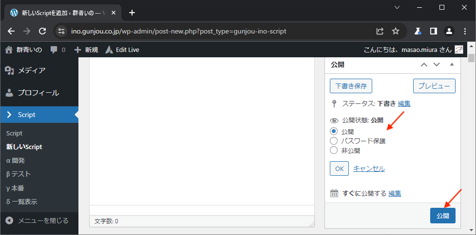 最後に公開状態を設定し、「公開」ボタンを選択して保存完了です。