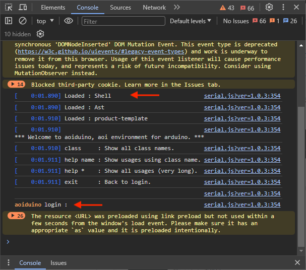 Aoiduino が正しく起動している場合は、[起動からの時間] 内容 (例 [0:01.890] Loaded : Shell) とログイン用のプロンプトが表示されています。Arduino IDE でのシリアルモニタに近いものと考えて大丈夫ですが、Aoiduino が出力する以外の内容も表示されることに注意してください。