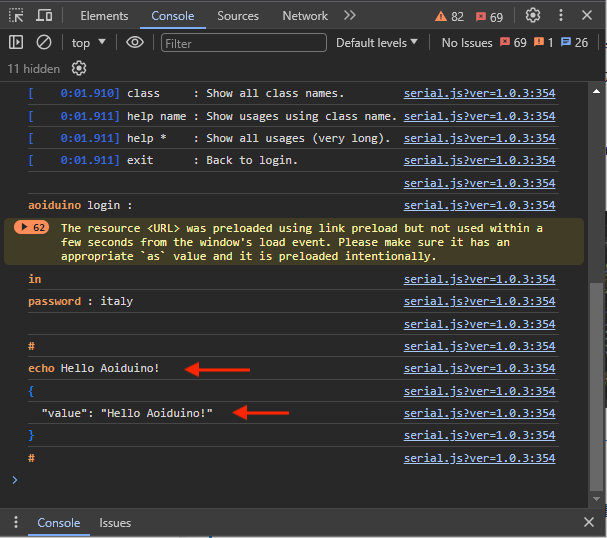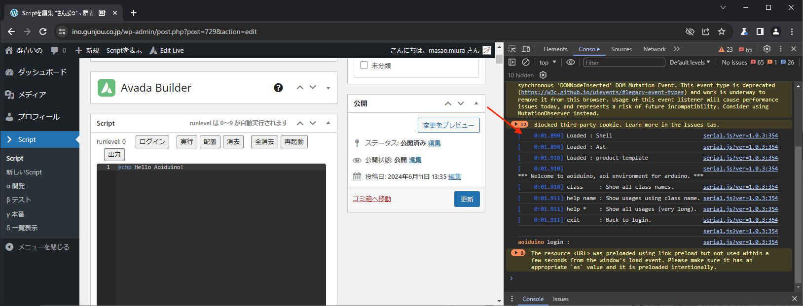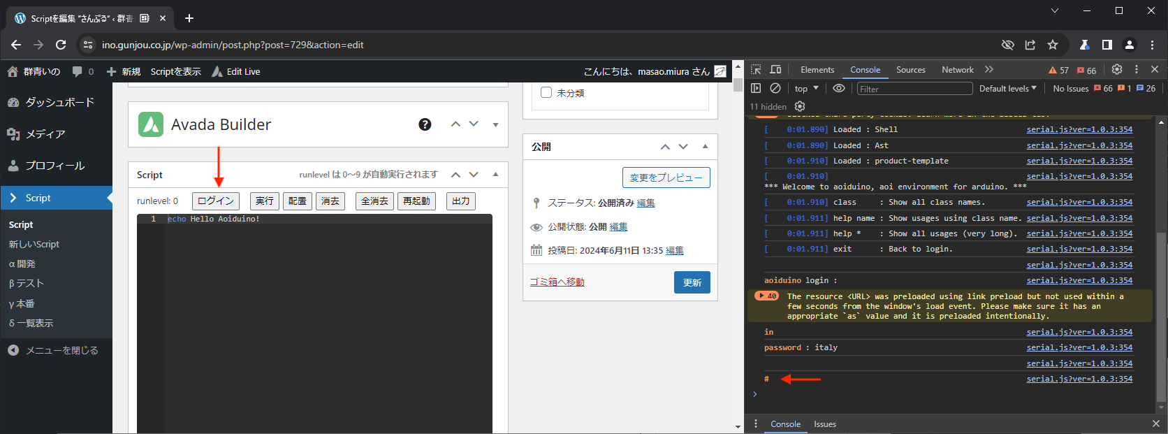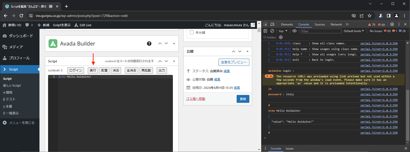 保存済みのスクリプトを実行してみましょう。ブラウザに内蔵されている開発者ツールと連携することで、Aoiduino からの出力結果も確認することができます。